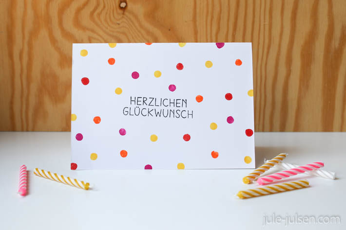 Mit der Radiererseite des Bleistifts werden in verschiedenen Farben Punkte auf das Papier gestempelt. Den Radierer habe ich bei jedem Farbwechsel mit einem Stück Küchenrolle gesäubert, da sich die Farben sonst vermischen. Außerdem empfehle ich, mit der hellsten Farbe zu starten und dann immer dunkler zu werden. Den Schriftzug könnt ihr entweder mit einem schwarzen Fineliner aufmalen oder ihr benutzt enen vorgefertigten Stempel. Wer möchte, kann auch die Innenseite der Karte auf diese Art gestalten - fertig!