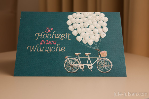 Karte mit einem Tandem, an dem eine Luftballontraube hängt