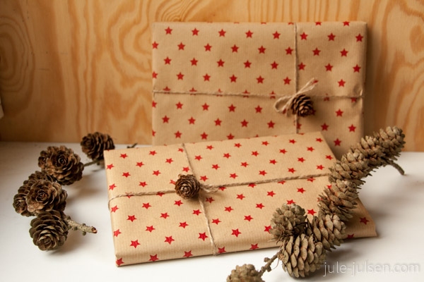Neben dem Sternchenpapier habe ich auch normales Packpapier verwendet, um einige der Geschenke zu verpacken. Die Flasche in der Mitte des Bildes habe ich am Hals mit einem Mix aus künstlichem Tannengrün und einem Kienapfel dekoriert. Auch mit weißem Tortenpapier lassen sich schöne Geschenkdekorationen herstellen.