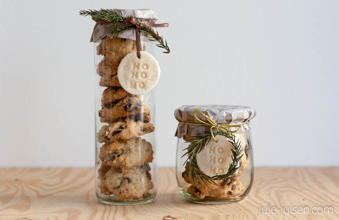 Legt den Deckel eures Glases auf das Papier und malt mit dem Stift in einem Abstand von ca. 5 cm drumherum. Anschließend schneidet ihr den Kreis aus. Nun kommt der Deckel auf euer Glas mit den Keksen, das Papier oben drauf und ihr bindet alles mit dem Geschenkband zu. Bevor die Schleife gebunden wird, kommen der Anhänger und der Tannenzweig dran - fertig.